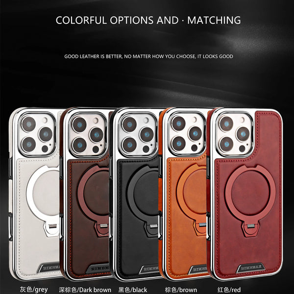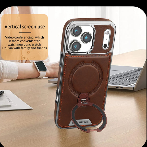 Magnetic Bracket Attraction Cowhide Leather Plating Phone Cover For iPhone 17/ 16/ 15/ 14